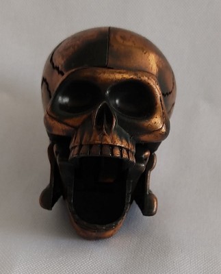 CAVEIRA - APONTADOR MINIATURA EM METAL ACOBREADO - 6 X3 X 5 CM - BEM CONSERVADO.