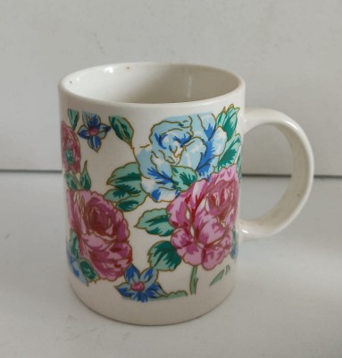 CANECA DECORADA EM PORCELANA - 9,5 X 12 X 8 CM - BEM CONSERVADA.