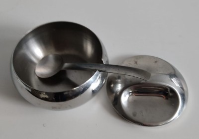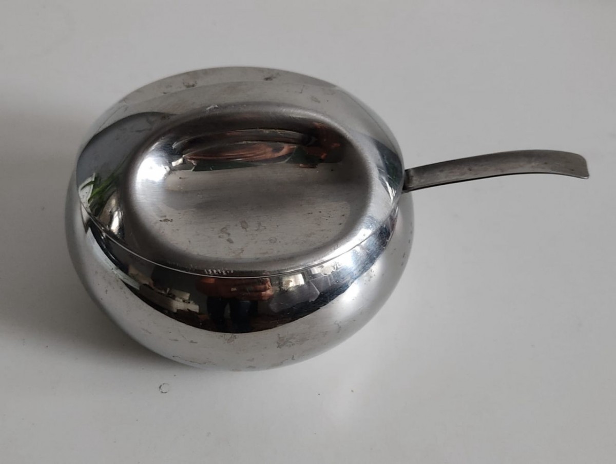 ACUÇAREIRO EM INOX COM COLHER - 6 X 10 DIAM - NECESSITANDO LIMPEZA.