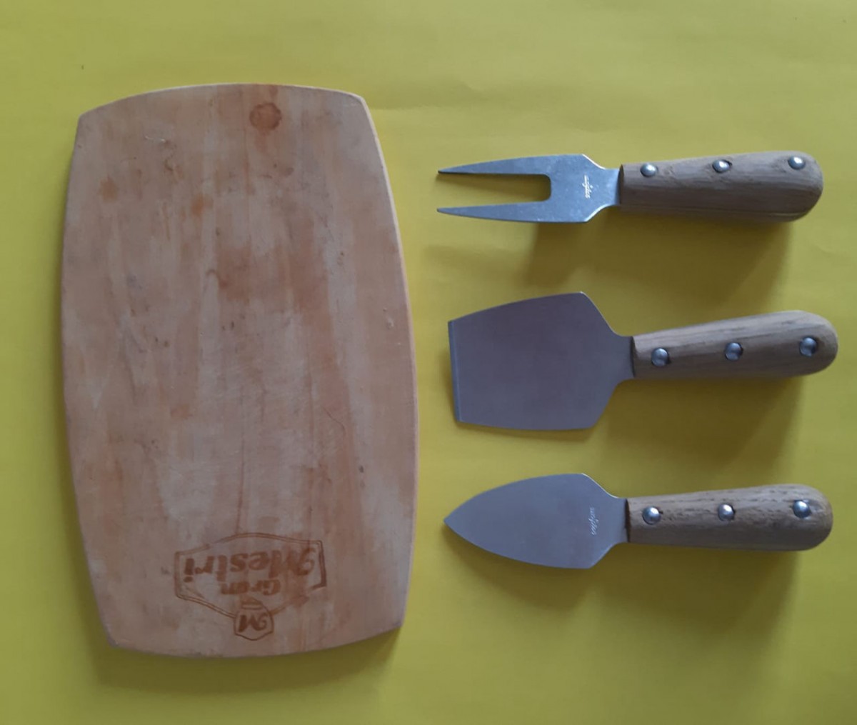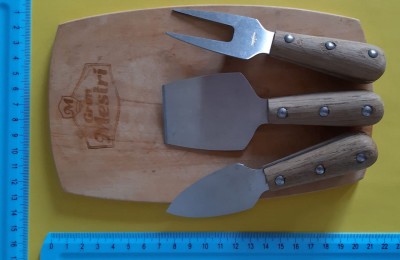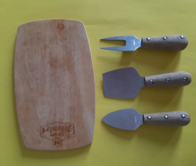 PEQUENA TÁBUA EM MADEIRA COM SEUS RESPECTIVOS TALHERES PARA QUEIJO - NOVA.
