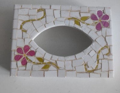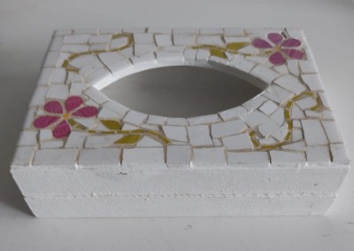 PORTA LENÇO EM MADEIRA COM TAMPA EM MOSAICO - 5 X 20 X 16 CM - BEM CONSERVADA.