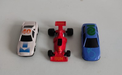 Lote composto por 3 mini carrinhos e metal pintado - aprox. 3 x 3 7 cm - novos.