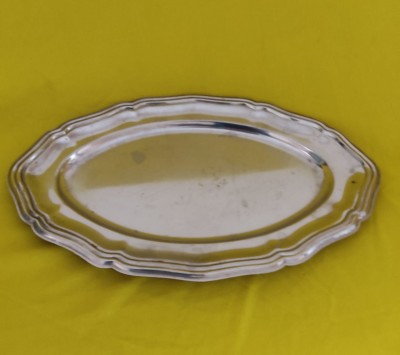 TRAVESSA OVAL EM INOX COM BORDAS EM ALTO RELEVO 35,5 X 22 CM - LEVES RISCOS.